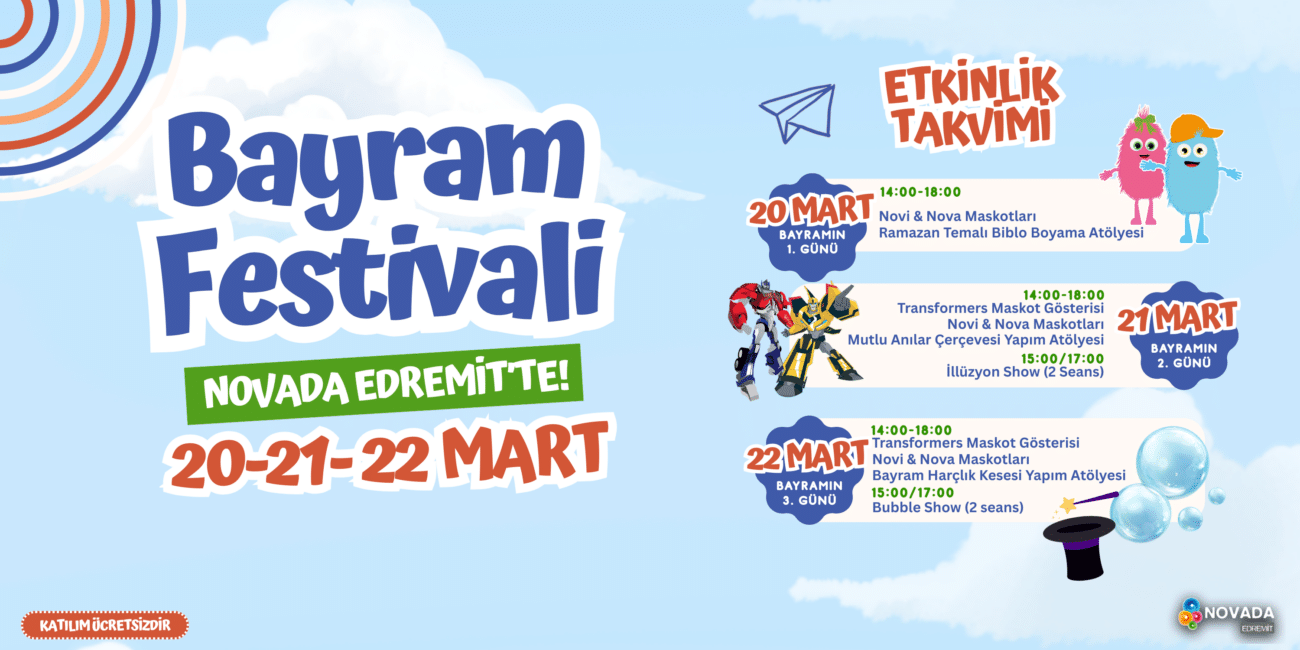 Mart 16, 2026 16 Mar 2026 BAYRAM FESTİVALİ NOVADA EDREMİT’TE! 🎉🌙 Bayram Festivali Novada Edremit’te! Devamını Oku