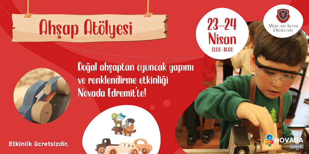 Nisan 19, 2022 19 Nis 2022 DOĞAL AHŞAPTAN OYUNCAK YAPIM ATÖLYESİ NOVADA EDREMİT’TE! 23 Nisan hafta sonunda Mercan Adası Okulları iş birliği ile çok eğlenceli bir etkinlik: Ahşap Atölye... Devamını Oku