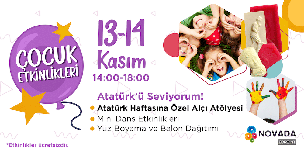 Kasım 11, 2021 11 Kas 2021 ARA TATİL ÇOCUK ETKİNLİKLERİ NOVADA EDREMİT’TE DEVAM EDİYOR! 13-14 Kasım hafta sonu günlerinde gerçekleştirilecek olan Atatürk Haftası'na özel alçı dökümü ve boy... Devamını Oku