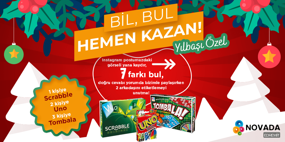 Aralık 14, 2020 14 Ara 2020 BİL, BUL, HEMEN KAZAN! NOVADA'DA YENİ YIL SÜRPRİZLERi! ⠀⠀⠀ ⠀⠀ BİL, BUL HEMEN KAZAN!⠀⠀ ⠀⠀⠀⠀ Doğru cevabı yorumda bizimle p... Devamını Oku
