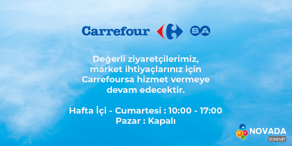 Nisan 30, 2021 30 Nis 2021 MARKET İHTİYAÇLARINIZ İÇİN CARREFOURSA HİZMETİNİZDEDİR! Haftanın 6 günü Carrefoursa market 10:00-17:00 saatleri arasında hizmet vermeye devam edecektir.⠀ *p... Devamını Oku