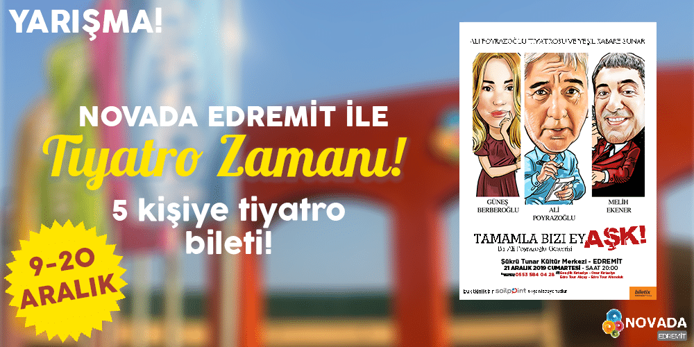 Aralık 9, 2019 09 Ara 2019 NOVADA EDREMİT İLE TİYATRO ZAMANI! Novada Edremit ile Tiyatro Zamanı!⠀ 21 Aralık Cumartesi günü oynanacak olan Tamamla Bizi Ey Aşk oyun... Devamını Oku