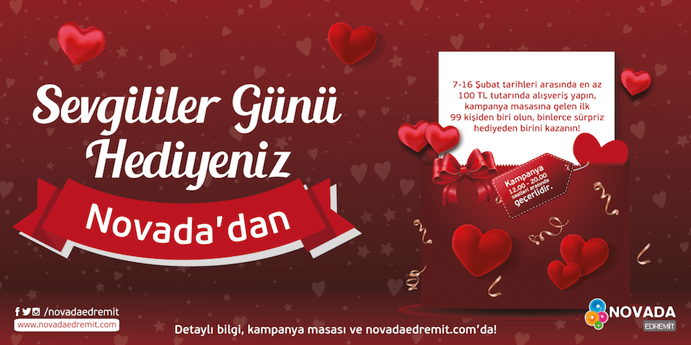 Şubat 6, 2018 06 Şub 2018 SEVGİLİLER GÜNÜ HEDİYENİZ NOVADA’DAN ! NOVADA EDREMİT SEVGİLİLER GÜNÜ KAMPANYA KURALLARI • Kampanya 07 – 16 Şubat 2018 tarihleri arasında... Devamını Oku
