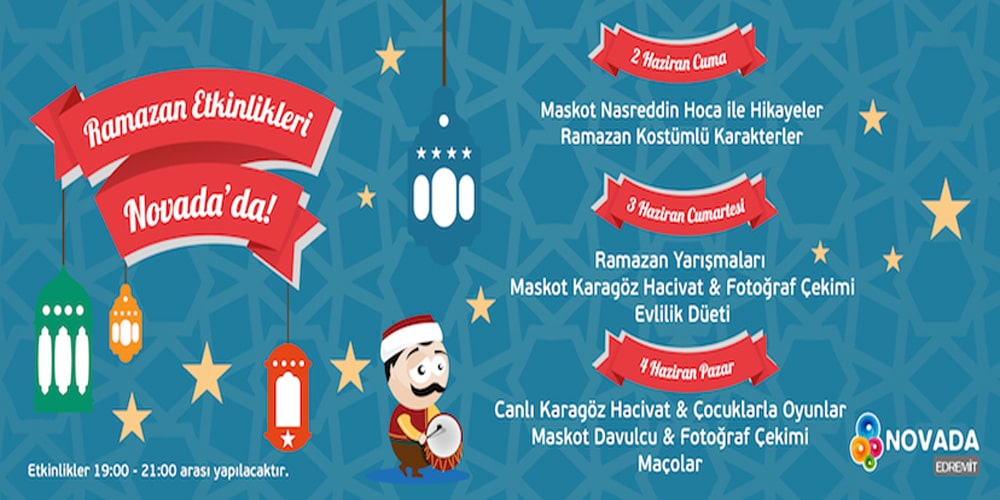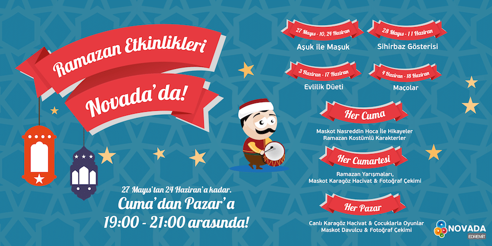Mayıs 26, 2017 26 May 2017 RAMAZAN ETKİNLİKLERİ NOVADA’DA! RAMAZANDA EĞLENCENİN TEK ADRESİ NOVADA Körfez'in en büyük alışveriş ve yaşam merkezi olan Novada Edr... Devamını Oku