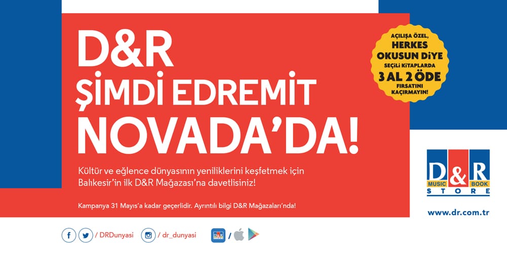 Mayıs 13, 2017 13 May 2017 D&R ŞİMDİ EDREMİT NOVADA’DA! D&R, şimdi Novada'da! Kültür ve eğlence dünyasının yeniliklerini keşfetmeniz için sizleri Balıke... Devamını Oku