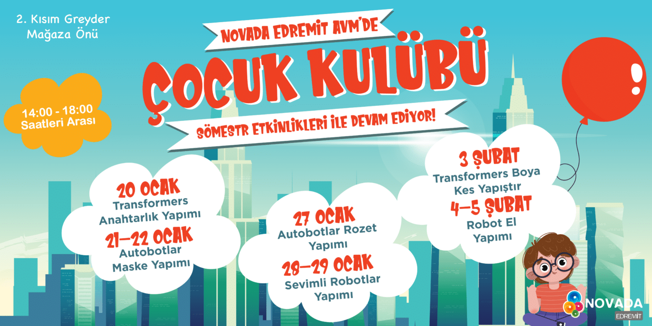 Ocak 18, 2023 18 Oca 2023 Novada Edremit Çocuk Kulübü Sömestr Etkinliklerini Sunar! Sömestr tatili boyunca Optimus Prime, Bumblebee ve birbirinden eğlenceli içerikler ile her cuma, cum... Devamını Oku
